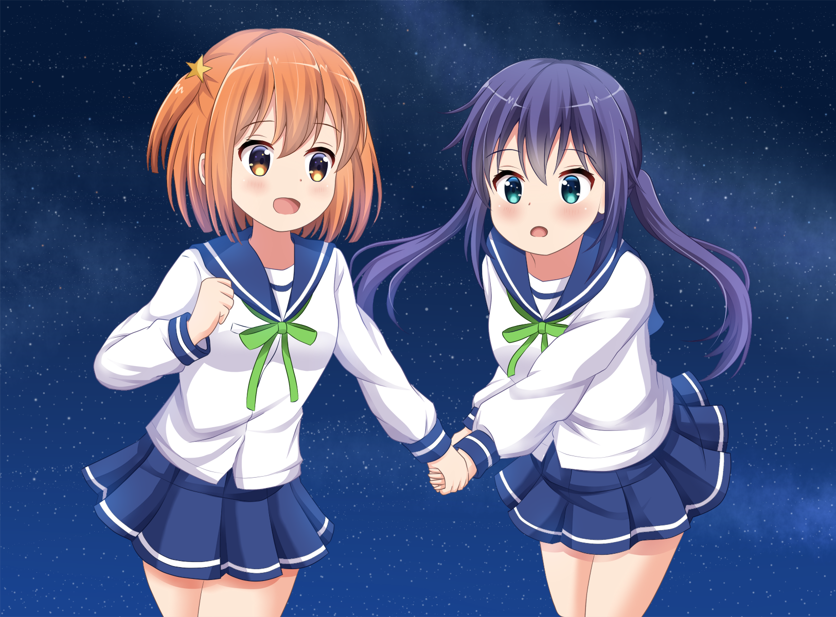 2girls :d blue_eyes blue_hair blue_sailor_collar blue_skirt blush bow breasts brown_eyes brown_hair commentary_request green_bow hair_ornament hand_grab highres koisuru_asteroid konohata_mira koyuki_(azumaya999) long_hair long_sleeves manaka_ao multiple_girls night one_side_up open_mouth outdoors pleated_skirt sailor_collar shirt skirt sky small_breasts smile star_(sky) star_(symbol) star_hair_ornament starry_sky twintails very_long_hair white_shirt