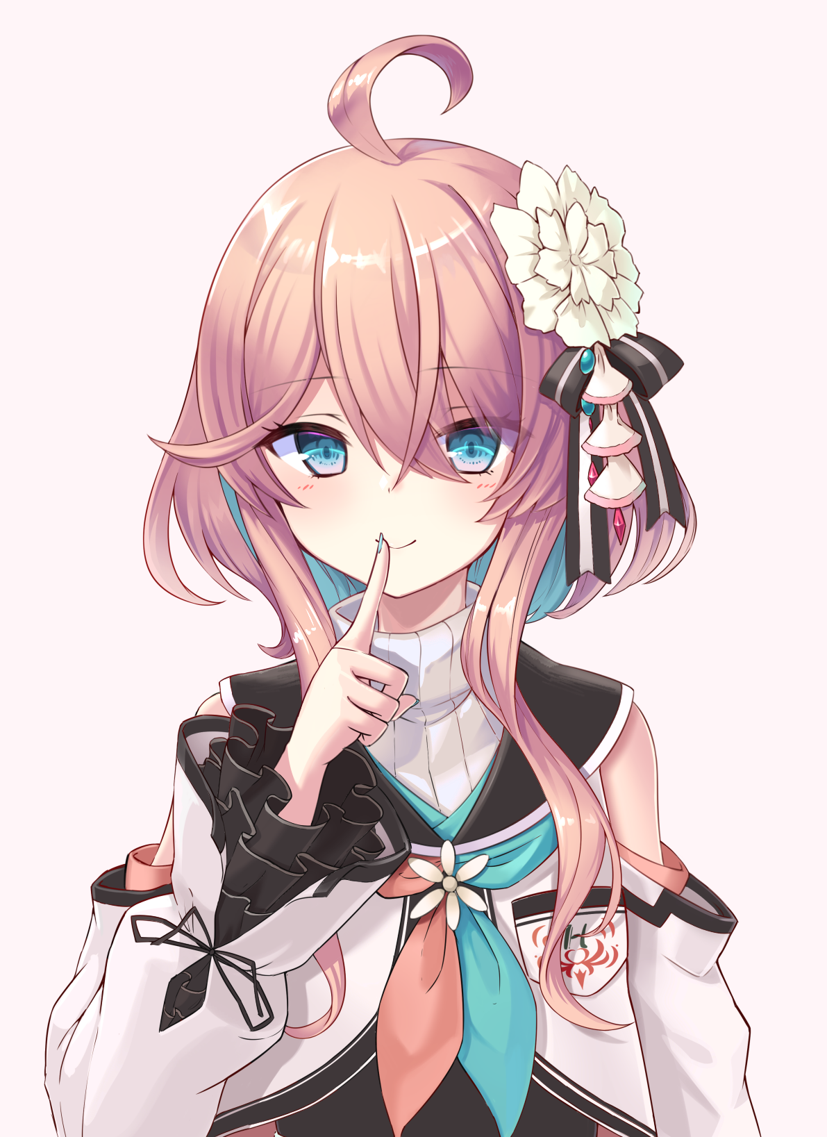 1girl ahoge bare_shoulders black_ribbon blue_eyes blue_hair blue_nails closed_mouth detached_sleeves emblem female_focus finger_to_mouth flower hair_flower hair_ornament hair_ribbon hanagumo_kuyuri highres hitotose_tanteidan index_finger_raised multicolored_hair nail_polish neckerchief pink_background pink_hair ribbon shinori_(efvbji6264) simple_background smile solo two-tone_hair virtual_youtuber