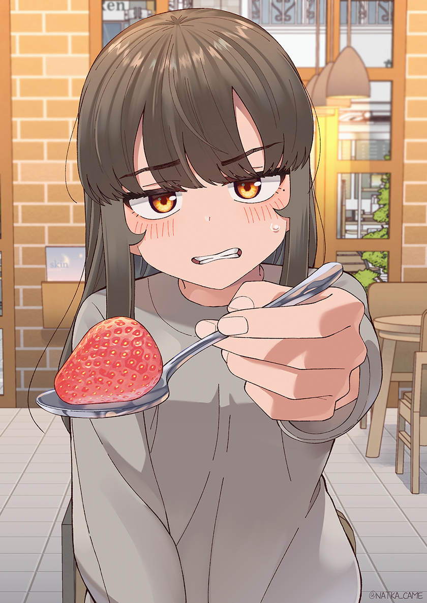 1girl blush breasts brown_eyes brown_hair day female_focus food fruit holding holding_spoon indoors long_hair long_sleeves looking_at_viewer medium_breasts nakta original parted_lips solo spoon strawberry sweat teeth twitter_username