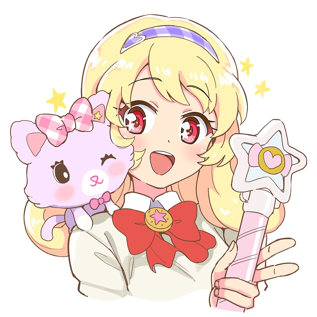 1girl :d blonde_hair blush bow bowtie cardigan commentary cropped_torso hair_ornament hairband heart heart_hair_ornament hinata_yume holding holding_wand long_hair looking_at_another mew_(mewkledreamy) mewkledreamy one_eye_closed open_mouth red_eyes round_teeth school_uniform shiny_skin simple_background smile star_(symbol) star_in_eye stuffed_animal stuffed_cat stuffed_toy symbol_in_eye teeth upper_body upper_teeth_only wand white_background yoban