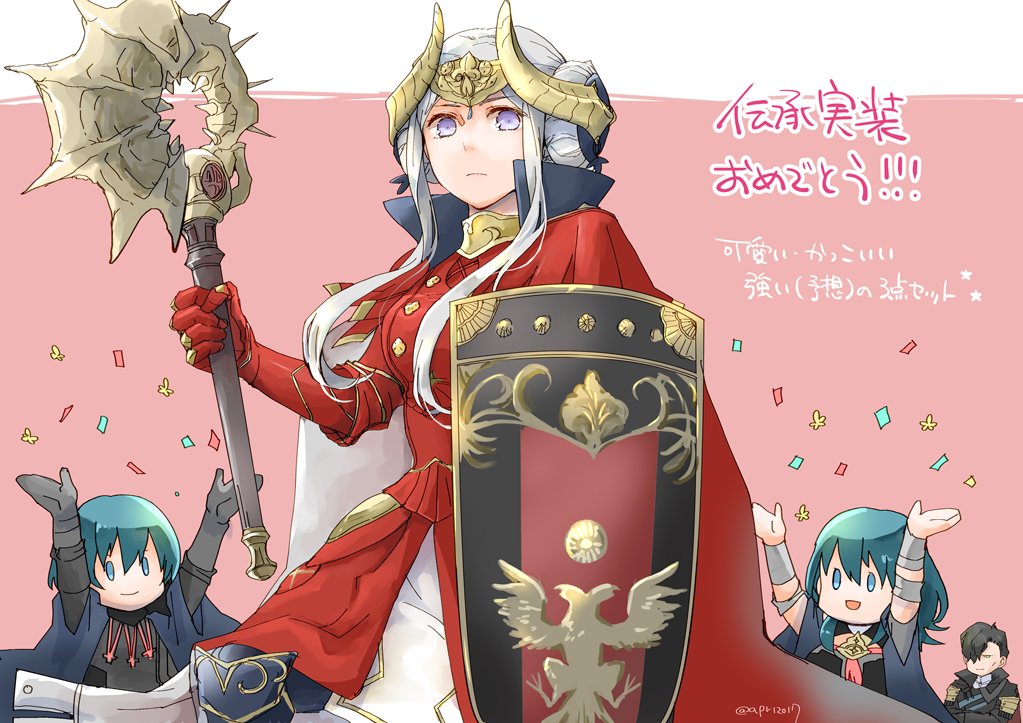 2boys 2girls :d armor axe aymr_(fire_emblem) blue_eyes blue_hair female_byleth_(fire_emblem) male_byleth_(fire_emblem) cape chibi chibi_inset confetti crown edelgard_von_hresvelg edelgard_von_hresvelg_(timeskip) fire_emblem fire_emblem:_three_houses gauntlets heroes_relic_(fire_emblem) horns hubert_von_vestra long_hair multiple_boys multiple_girls nintendo open_mouth purple_eyes red_cape robaco serious shield silver_hair smile solo_focus translation_request twitter_username