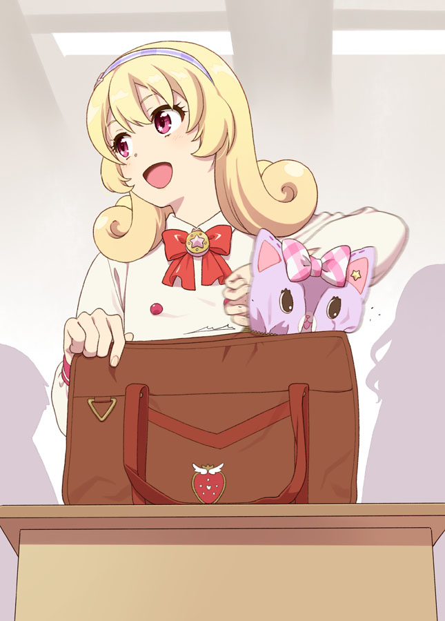 1girl :d bag blonde_hair blush bow bowtie classroom commentary_request desk food_print from_below fruit_print hairband handbag hinata_yume long_hair looking_away mattaku_mousuke mew_(mewkledreamy) mewkledreamy motion_blur open_mouth pink_eyes school_bag school_desk smile solo_focus star_(symbol) star_in_eye strawberry_print stuffed_animal stuffed_cat stuffed_toy symbol_in_eye zipper zipping