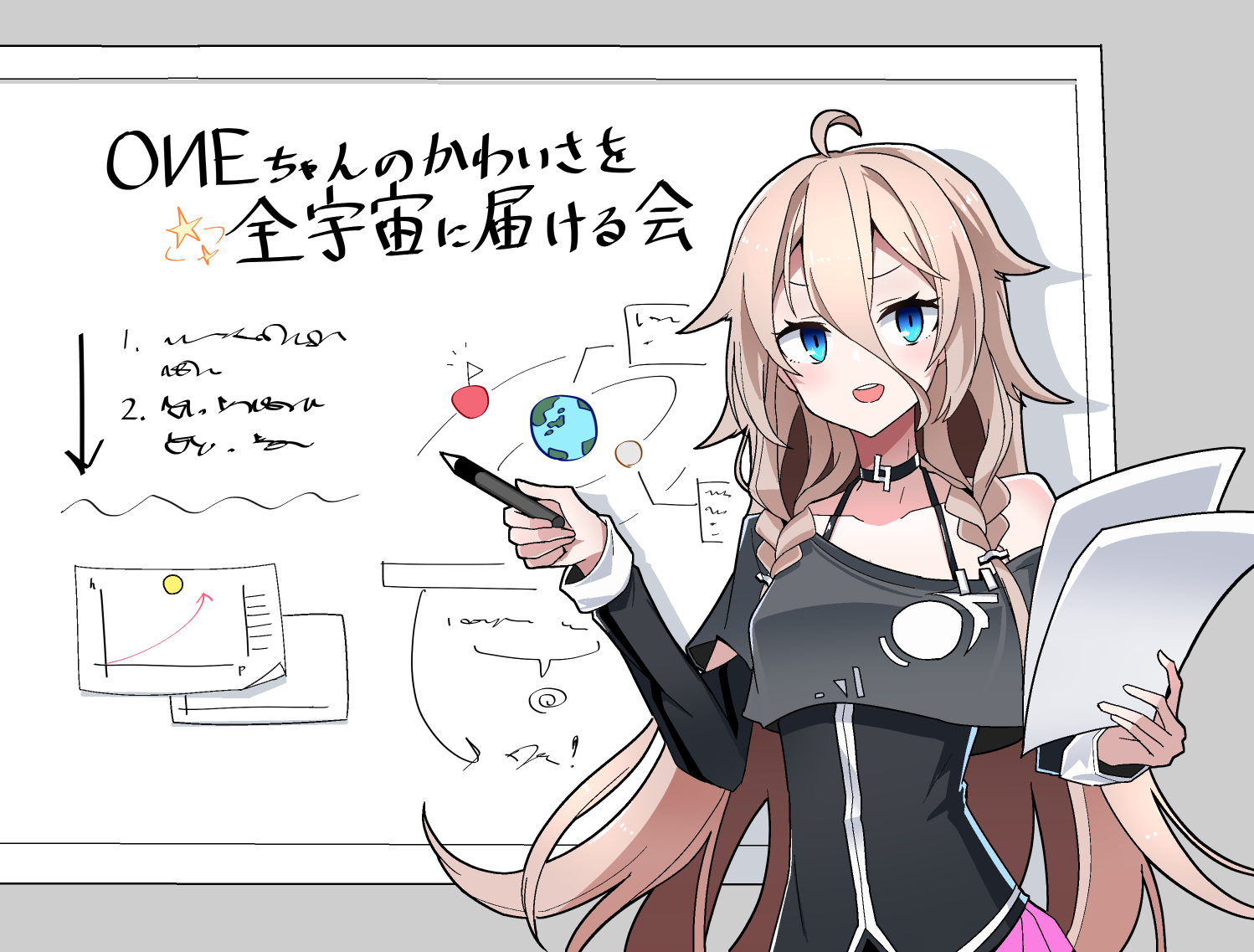 1girl arrow_(projectile) bad_id bad_pixiv_id black_shirt blue_eyes cevio chart earth_(planet) female_focus flag holding holding_paper holding_pen ia_(vocaloid) long_hair looking_at_viewer off-shoulder_shirt off_shoulder open_mouth paper pen pink_skirt planet platinum_blonde_hair shidoh279 shirt skirt smile solo translated v-shaped_eyebrows very_long_hair vocaloid whiteboard