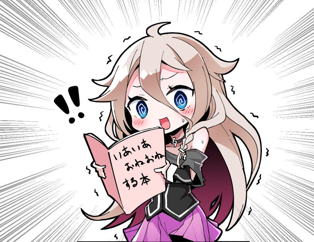 ! !! 1girl @_@ bad_id bad_pixiv_id black_shirt blue_eyes blush book cevio chibi emphasis_lines female_focus holding holding_book ia_(vocaloid) long_hair off-shoulder_shirt off_shoulder pink_skirt platinum_blonde_hair reading shidoh279 shirt skirt solo surprised translated trembling upper_body very_long_hair vocaloid