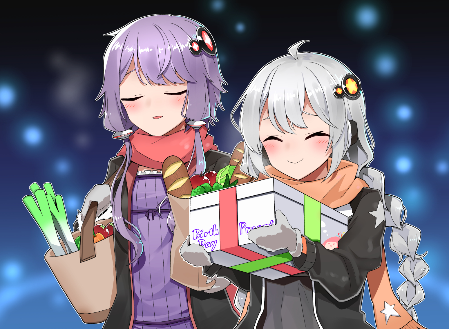 2girls apple bad_id bad_pixiv_id bag baguette black_dress black_jacket blurry blurry_background box braid bread cabbage carrying_bag dress closed_eyes food fruit gift gift_box hair_ornament holding holding_box jacket kizuna_akari long_hair mittens multiple_girls orange_scarf parted_lips purple_dress purple_hair red_scarf scarf shidoh279 shopping_bag short_hair_with_long_locks sidelocks silver_hair smile spring_onion star_(symbol) star_print tomato twin_braids upper_body vocaloid voiceroid yuzuki_yukari