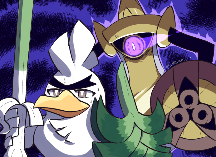 aegislash aura bird brown_eyes commentary_request creature energy gen_6_pokemon gen_8_pokemon holding holding_sword holding_weapon impending_doom looking_at_another nintendo no_humans ozziemochi pokemon pokemon_(creature) purple_eyes shield signature single_eye sirfetch'd sweat sword weapon