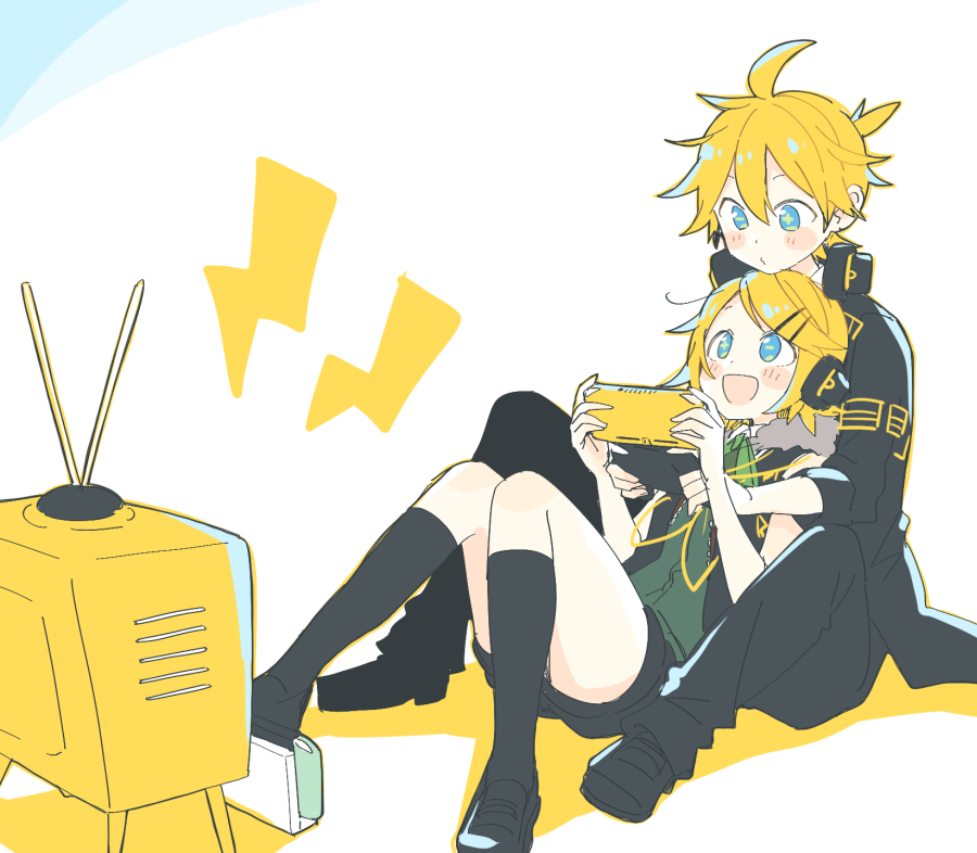 1boy 1girl black_jacket black_socks blonde_hair blue_eyes blush brother_and_sister chin_rest commentary green_shirt hair_ornament hairclip handheld_game_console head_on_head head_rest headphones holding holding_handheld_game_console jacket kagamine_len kagamine_rin kneehighs neckerchief open_mouth project_diva_(series) kagamine_len_(receiver) remote_control_(vocaloid) shirt siblings sitting sitting_on_lap sitting_on_person smile socks suzumi_(fallxalice) swept_bangs television kagamine_rin_(transmitter) twins vocaloid