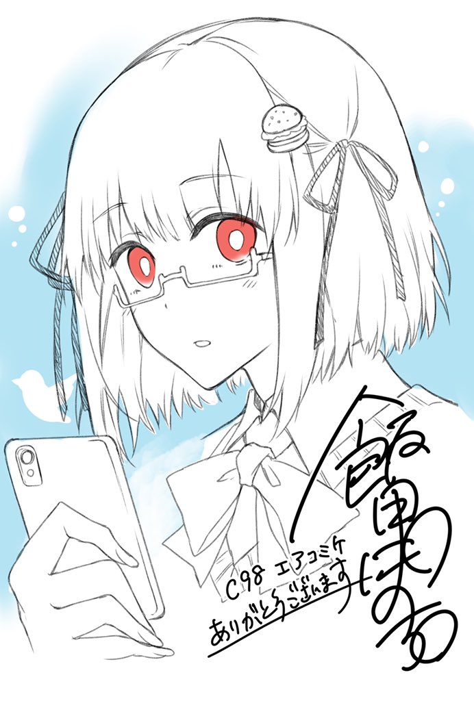 1girl blue_background borrowed_character bow bowtie burger burger_hair_ornament cellphone female_focus food food-themed_hair_ornament glasses greyscale hair_ornament hair_ribbon hamburger-chan_(nekoume) holding holding_phone looking_at_viewer monochrome original phone pochi_(pochi-goya) profile red_eyes ribbon short_hair signature sketch smartphone solo spot_color