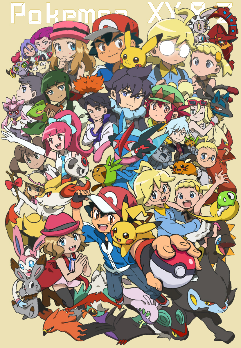 6+boys 6+girls :d ;) ahoge alain_(pokemon) animal_ear_fluff animal_nose aria_(pokemon_anime) ash-greninja ash_ketchum professor_sycamore baseball_cap bird black_eyes blaziken blonde_hair blue_eyes bonnie_(pokemon) braixen brother_and_sister brown_hair bunnelby chespin clembot_(pokemon) clemont_(pokemon) closed_mouth commentary_request copyright_name creature crossed_arms dark_skin dedenne diancie diantha_(pokemon) dual_persona eye_contact gen_1_pokemon gen_3_pokemon gen_4_pokemon gen_6_pokemon gen_7_pokemon glasses goodra green_eyes greninja gym_leader hat hawlucha heliolisk highres holding holding_poke_ball holding_stick hoopa hoopa_(confined) james_(pokemon) jessie_(pokemon) korrina_(pokemon) legendary_pokemon long_hair looking_at_another lucario luxray lysandre_(pokemon) magearna magearna_(normal) mairin_(pokemon) male_focus mega_lucario mega_pokemon meowth multiple_boys multiple_girls multiple_persona mythical_pokemon nintendo noivern one_eye_closed opaque_glasses open_mouth pancham pikachu poke_ball poke_ball_(basic) pokemon pokemon_(anime) pokemon_(creature) pokemon_performer pokemon_the_series:_xy ponytail sawyer_(pokemon) sceptile serena_(pokemon) shauna_(pokemon) short_hair siblings simple_background smile snout steven_stone stick sunglasses sylveon talonflame team_rocket team_rocket_uniform twintails ukata volcanion yellow_background zygarde zygarde_core