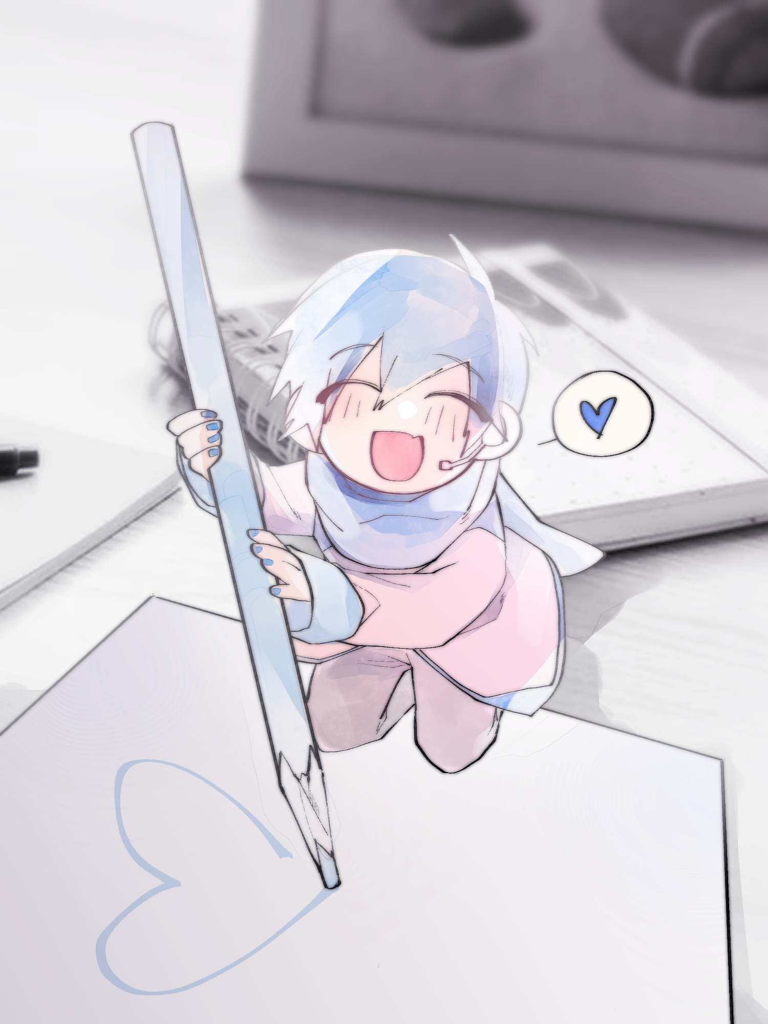 1boy binggwaryu black_pants blue_hair blue_nails blue_scarf closed_eyes coat commentary drawing facing_viewer fang headset heart highres holding holding_pencil kaito_(vocaloid) kneeling male_focus mini_person miniboy nail_polish notepad open_mouth pants paper pencil photo_background scarf skin_fang smile spoken_heart spot_color untranslatable_commentary vocaloid white_coat