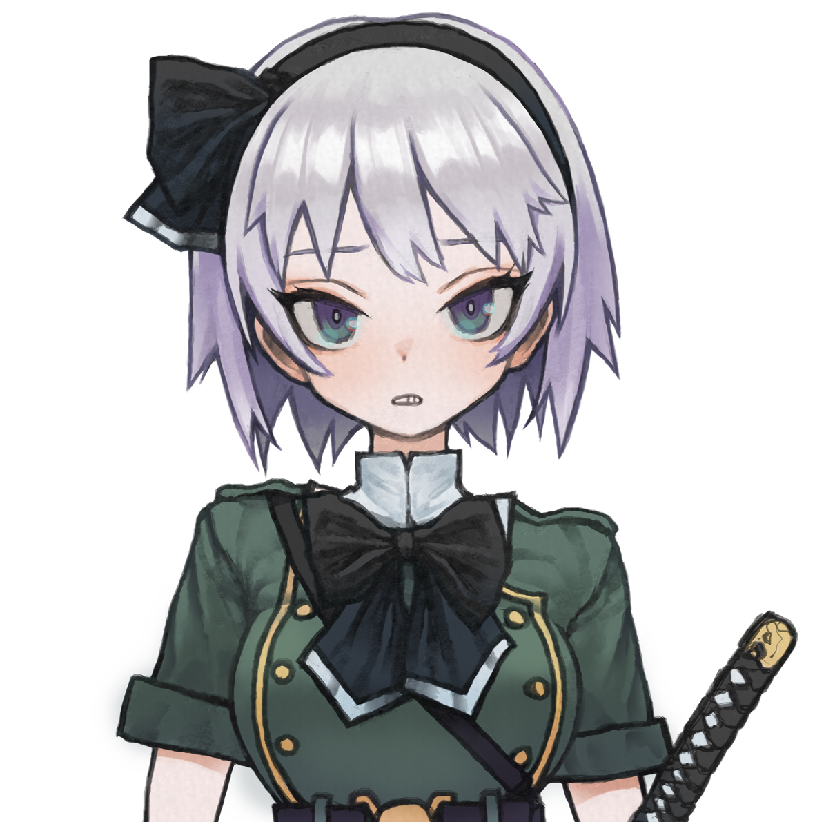 1girl adapted_costume ashitano_kirin belt black_hairband black_neckwear black_ribbon blue_eyes breasts commentary female_focus green_shirt hair_ribbon hairband katana konpaku_youmu looking_at_viewer medium_breasts ribbon scowl shirt short_hair short_sleeves simple_background solo sword touhou upper_body weapon