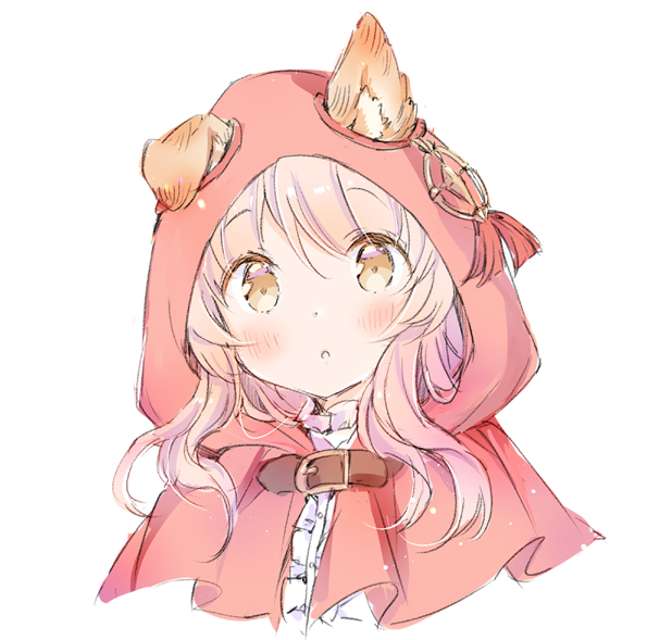 1girl animal_ears belt capelet commentary_request ears_through_headwear female_focus hair_ornament hood hooded_capelet hoodie looking_at_viewer medium_hair original pink_hair portrait red_hoodie shirt sidelocks simple_background one_ear_down solo swept_bangs wataame27 white_background white_shirt wolf-chan_(wataame27) wolf_ears wolf_girl