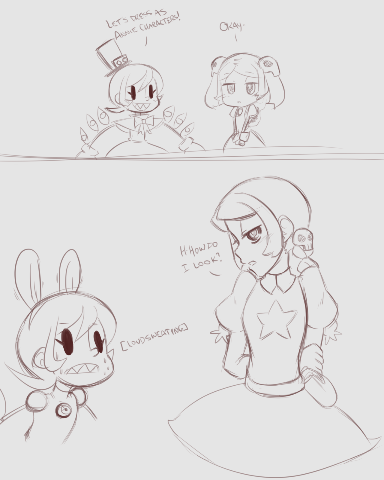 2girls alternate_hairstyle animal_ears annie_(skullgirls) annie_(skullgirls)_(cosplay) apron arms_behind_back bloody_marie_(skullgirls) blush bow braid comic cosplay dress hair_ornament hat highres malofantastic monochrome multiple_girls peacock_(skullgirls) rabbit_ears sagan_(skullgirls) sagan_(skullgirls)_(cosplay) sharp_teeth short_dress short_hair skull_hair_ornament skullgirls sweatdrop teeth top_hat twin_braids twintails