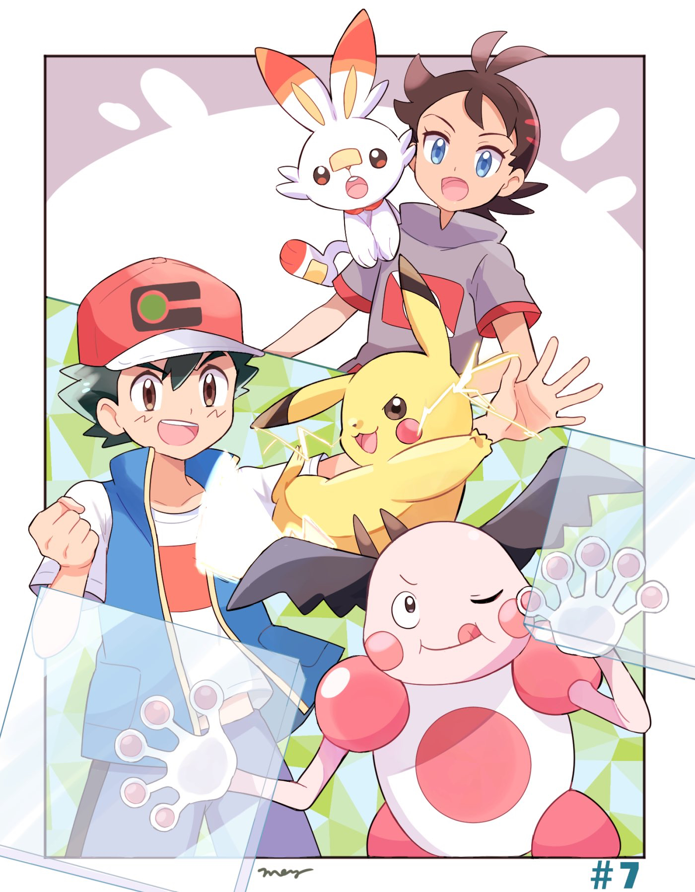 2boys :d ash_ketchum bad_id bad_pixiv_id baseball_cap black_hair black_shirt blouse blue_eyes blue_jacket blue_pants border brown_eyes clenched_hand commentary_request creature dark-skinned_male dark_skin electricity episode_number gen_1_pokemon gen_8_pokemon goh_(pokemon) grey_shirt hat highres jacket looking_at_another male_focus mei_(maysroom) mr._mime multiple_boys nintendo on_shoulder one_eye_closed open_mouth pants pikachu pokemon pokemon_(anime) pokemon_(creature) pokemon_journeys pokemon_move pokemon_on_shoulder rabbit red_headwear reflect_(pokemon) scorbunny shirt signature smile standing teeth upper_teeth_only white_border white_shirt