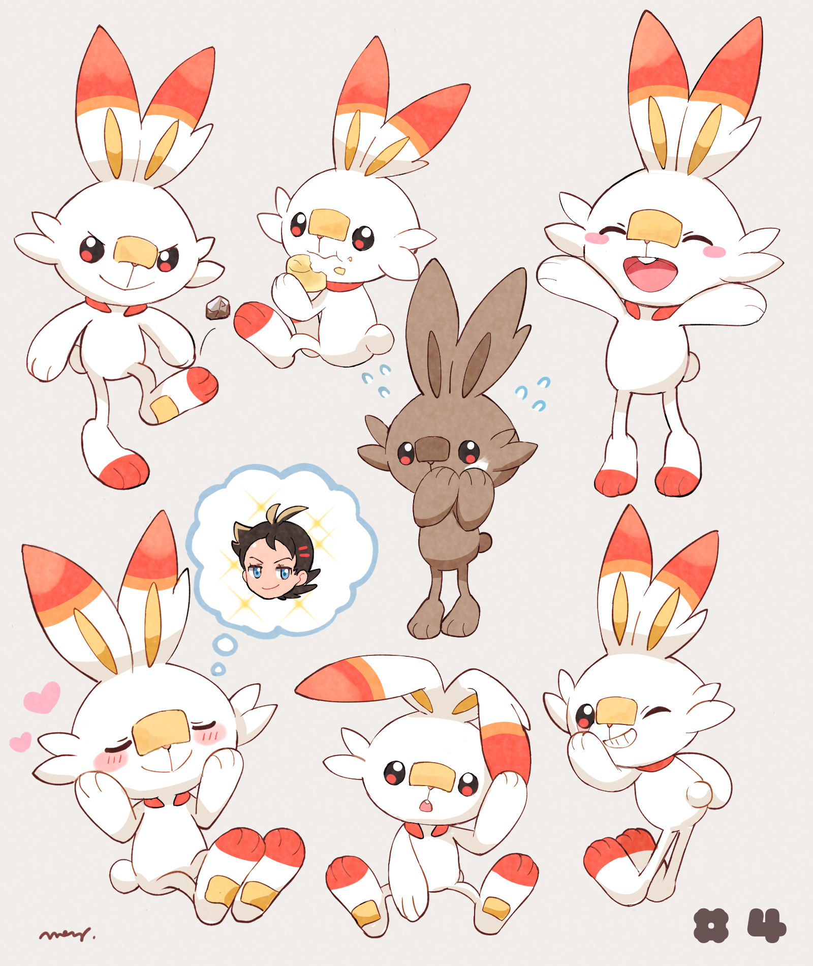 1boy :d ^_^ akanbe arms_up bad_id bad_pixiv_id blue_eyes blush_stickers closed_eyes commentary_request dark-skinned_male dark_skin dirty eating episode_number eyelid_pull flying_sweatdrops food food_on_face gen_8_pokemon goh_(pokemon) grin hands_on_own_cheeks hands_on_own_face happy heart highres holding holding_food imagining kicking mei_(maysroom) nintendo open_mouth pokemon pokemon_(anime) pokemon_(creature) pokemon_journeys rabbit scone scorbunny smile sparkle speech_bubble standing stone thought_bubble tongue tongue_out |d