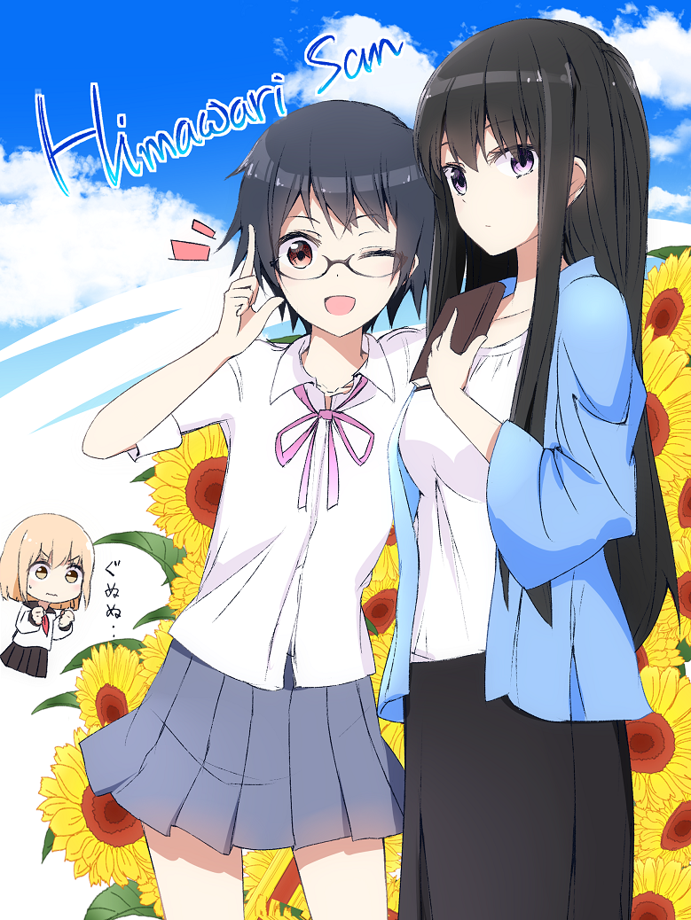 3girls :d ;d a.a_(aa772) black_hair black_sailor_collar black_skirt blue_shirt blue_sky blush book breasts brown_eyes character_name chibi chibi_inset clenched_hands closed_mouth cloud cloudy_sky collared_shirt commentary_request copyright_name cowboy_shot day flower glasses grey_skirt himawari-san himawari-san_(character) holding holding_book jealous kazamatsuri_fuuko kazamatsuri_matsuri light_brown_hair long_hair looking_at_viewer medium_breasts multiple_girls name_connection neckerchief notice_lines object_namesake one_eye_closed open_mouth pink_ribbon pleated_skirt purple_eyes red_neckerchief ribbon sailor_collar school_uniform shirt short_hair siblings sisters skirt sky smile standing sunflower sweatdrop v-shaped_eyebrows wavy_mouth white_shirt
