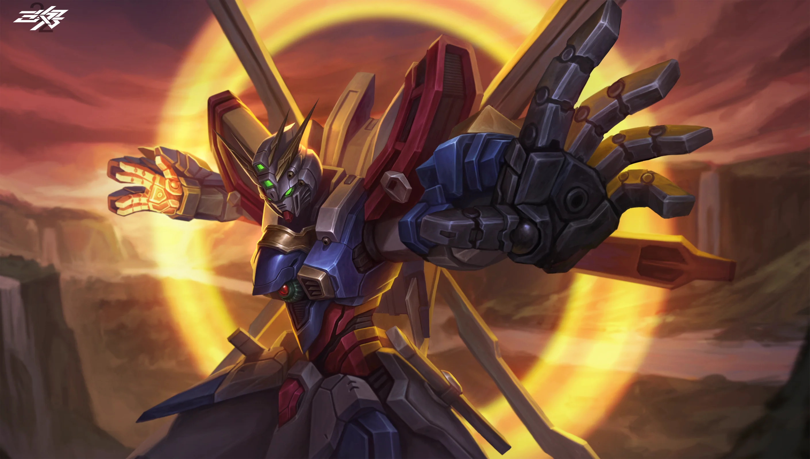 3ok artist_request bakunetsu_god_finger fighting_stance fire g_gundam glowing glowing_eyes god_gundam green_eyes gundam halo highres looking_at_viewer mecha mechanization mountain no_humans ocean robot solo super_robot weapon