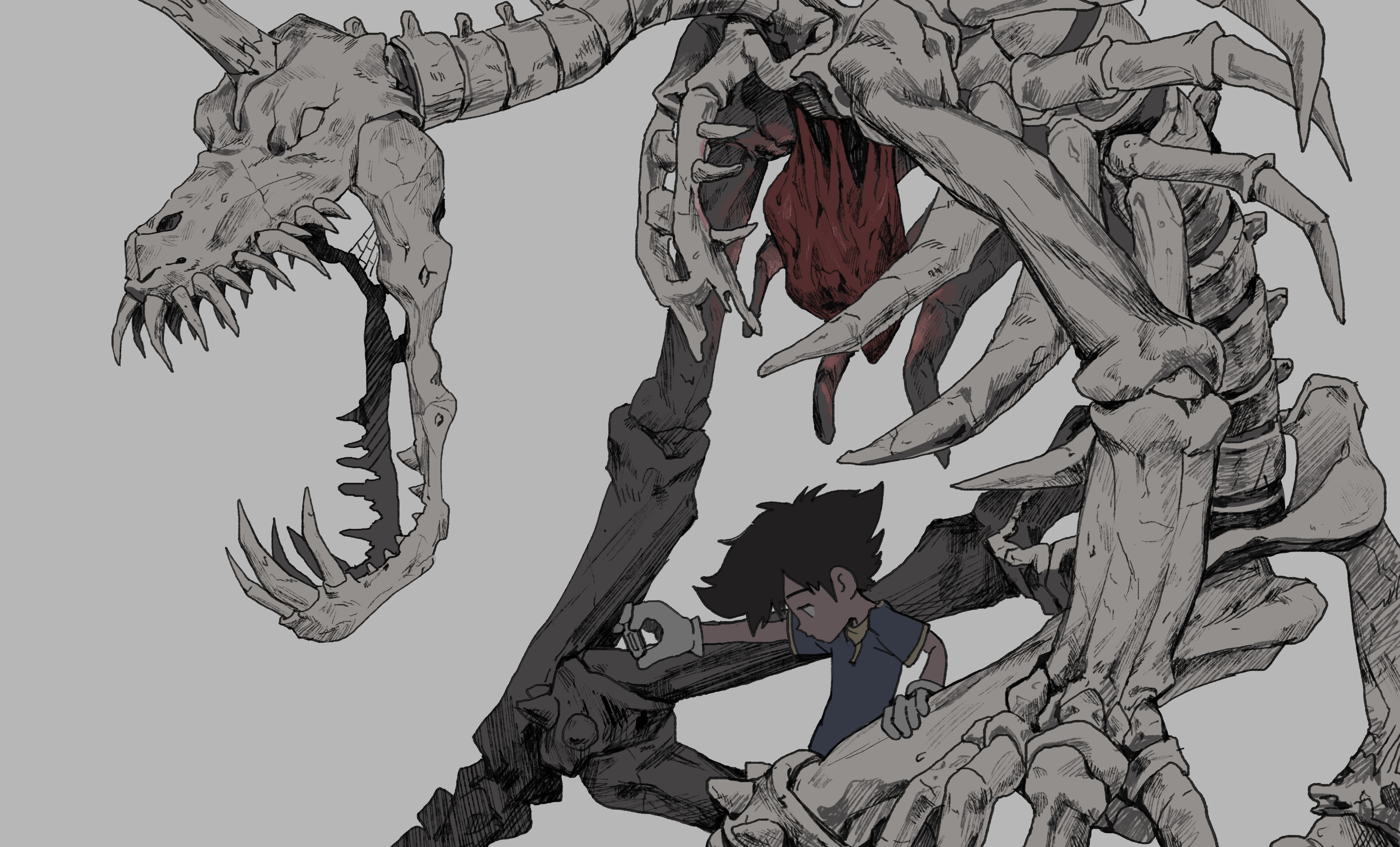 1boy absurdres bone brown_hair digimon digimon_(creature) digimon_adventure dinosaur gloves grey_background heart highres holding horns male_focus muted_color open_mouth organs sharp_teeth silk simple_background single_horn skeleton skullgreymon spider_web tantanmen teeth textless_version white_gloves yagami_taichi