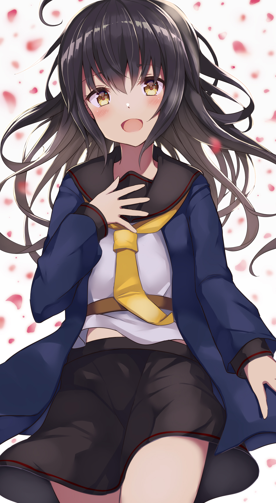 1girl :d ahoge black_hair black_sailor_collar black_skirt blue_jacket blush cowboy_shot female_focus hair_between_eyes highres jacket kantai_collection long_hair long_sleeves mikazuki_(kancolle) natsu_narumi neckerchief open_mouth original_remodel_(kantai_collection) sailor_collar school_uniform serafuku skirt smile solo yellow_eyes yellow_neckerchief