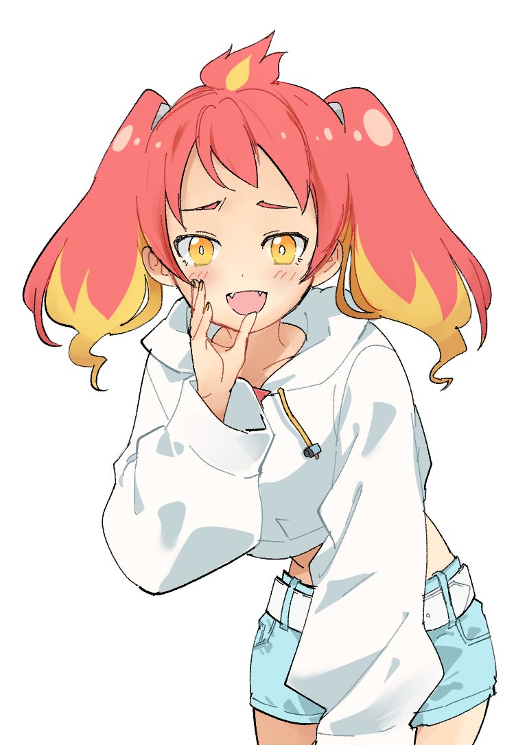 1girl :d belt blonde_hair blue_shorts blush commentary_request cowboy_shot crop_top drawstring fangs female_focus hand_to_own_mouth hand_up hikasa_tomoshika hood hood_down hoodie kiko_(kikobooom) leaning_forward long_hair long_sleeves looking_at_viewer midriff multicolored_hair nail_polish open_mouth orange_eyes puffy_long_sleeves puffy_sleeves red_hair short_shorts shorts simple_background smile solo twintails two-tone_hair virtual_youtuber voms white_background white_belt white_hoodie yellow_eyes
