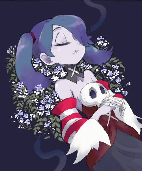 1girl 2016 770mk blue_background blue_hair blue_skin closed_eyes collarbone colored_skin corset detached_collar dress female_focus flower hair_over_one_eye lying own_hands_together skullgirls solo squigly_(skullgirls) stitches striped twintails zombie