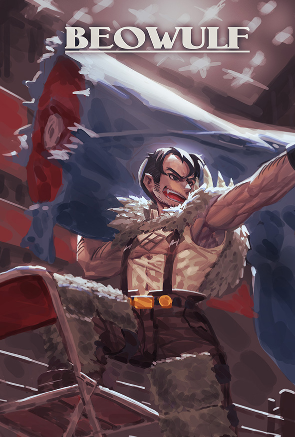 1boy 2018 belt belt_buckle beowulf_(skullgirls) black_hair boots bracelet buckle chair character_name disembodied_hand facial_hair fangs folding_chair fur_trim gesture indoors jewelry muscular open_mouth short_hair sideburns skullgirls smile solo stadium stubble suspenders wrestling_ring zakusi