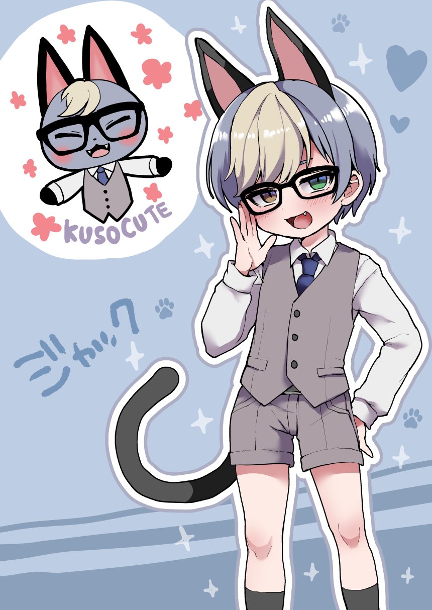 1boy :3 adjusting_eyewear animal_crossing animal_crossing:_new_horizons animal_ears black_socks blonde_hair blouse blush cat_boy cat_ears cat_tail character_name collared_shirt extra_ears fang fangs full_body green_eyes hair_between_eyes heterochromia highres inset looking_at_viewer male_focus multicolored_hair necktie nintendo open_mouth personification raymond_(animal_crossing) shirt shorts silver_hair smile socks solo tail two-tone_hair usagigenki vest white_shirt yellow_eyes