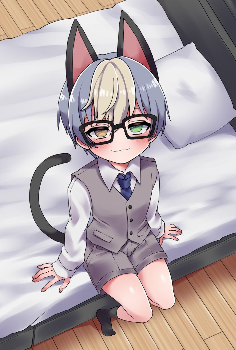 1boy :3 animal_crossing animal_crossing:_new_horizons animal_ears black_socks blonde_hair blush cat_boy cat_ears cat_tail collared_shirt extra_ears full_body green_eyes hair_between_eyes heterochromia looking_at_viewer looking_up male_focus multicolored_hair necktie nintendo on_bed personification pillow raymond_(animal_crossing) shirt shorts silver_hair sitting smile socks solo tail two-tone_hair usagigenki vest white_shirt yellow_eyes