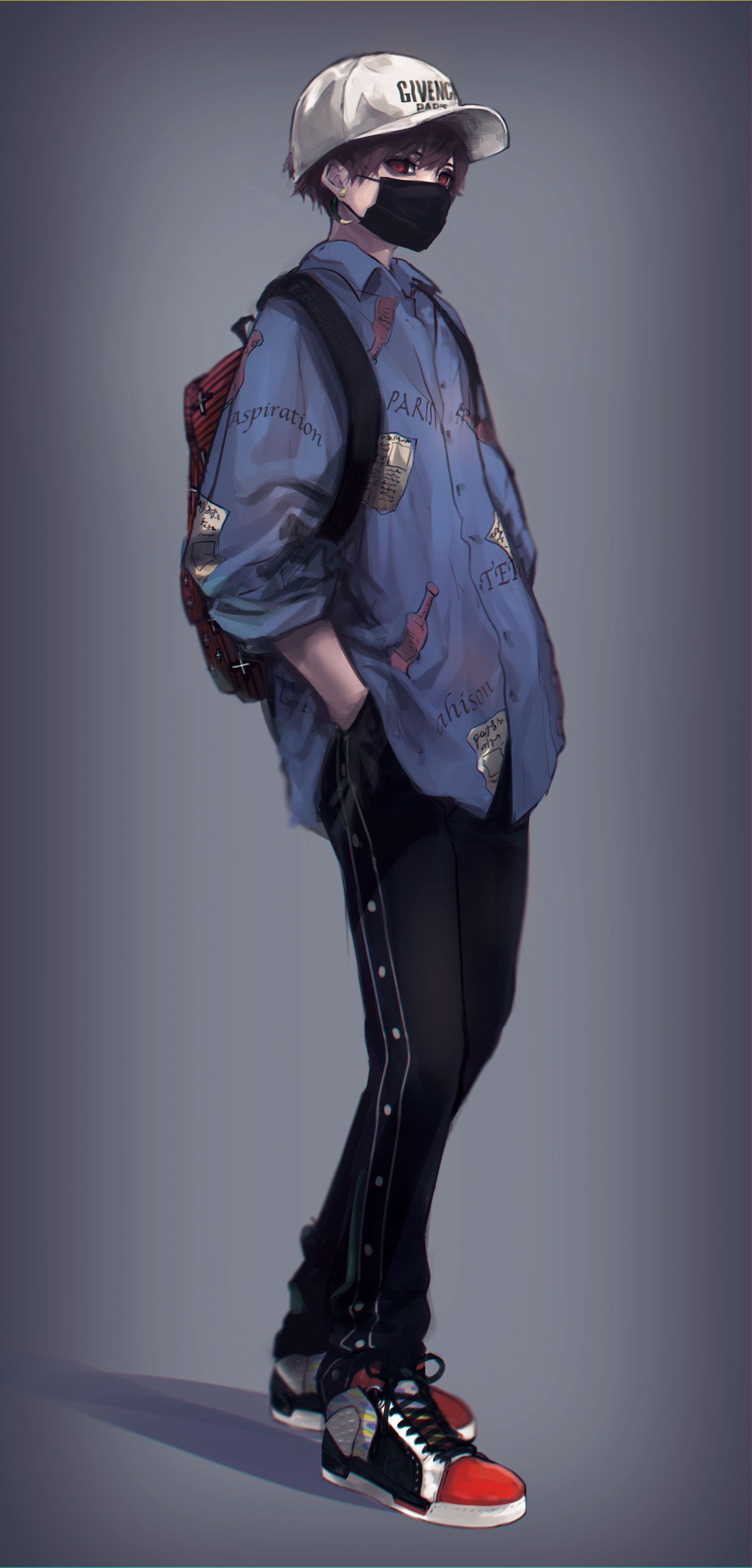 1boy absurdres backpack bag baseball_cap black_pants blue_shirt brown_hair christian_louboutin_(brand) covered_mouth earrings full_body givenchy grey_background hat highres jewelry looking_down male_focus mask mouth_mask original pants rakugaki_suruhito red_eyes shirt solo standing white_hat