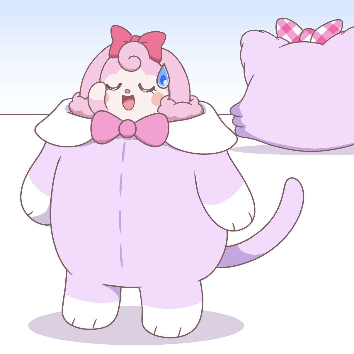 1girl character_request cocotama_(series) cosplay female_focus highres kamisama_minarai:_himitsu_no_cocotama kato-shun kigurumi mew_(mewkledreamy) mewkledreamy no_humans simple_background solo sweatdrop toyosaki_aki voice_actor_connection