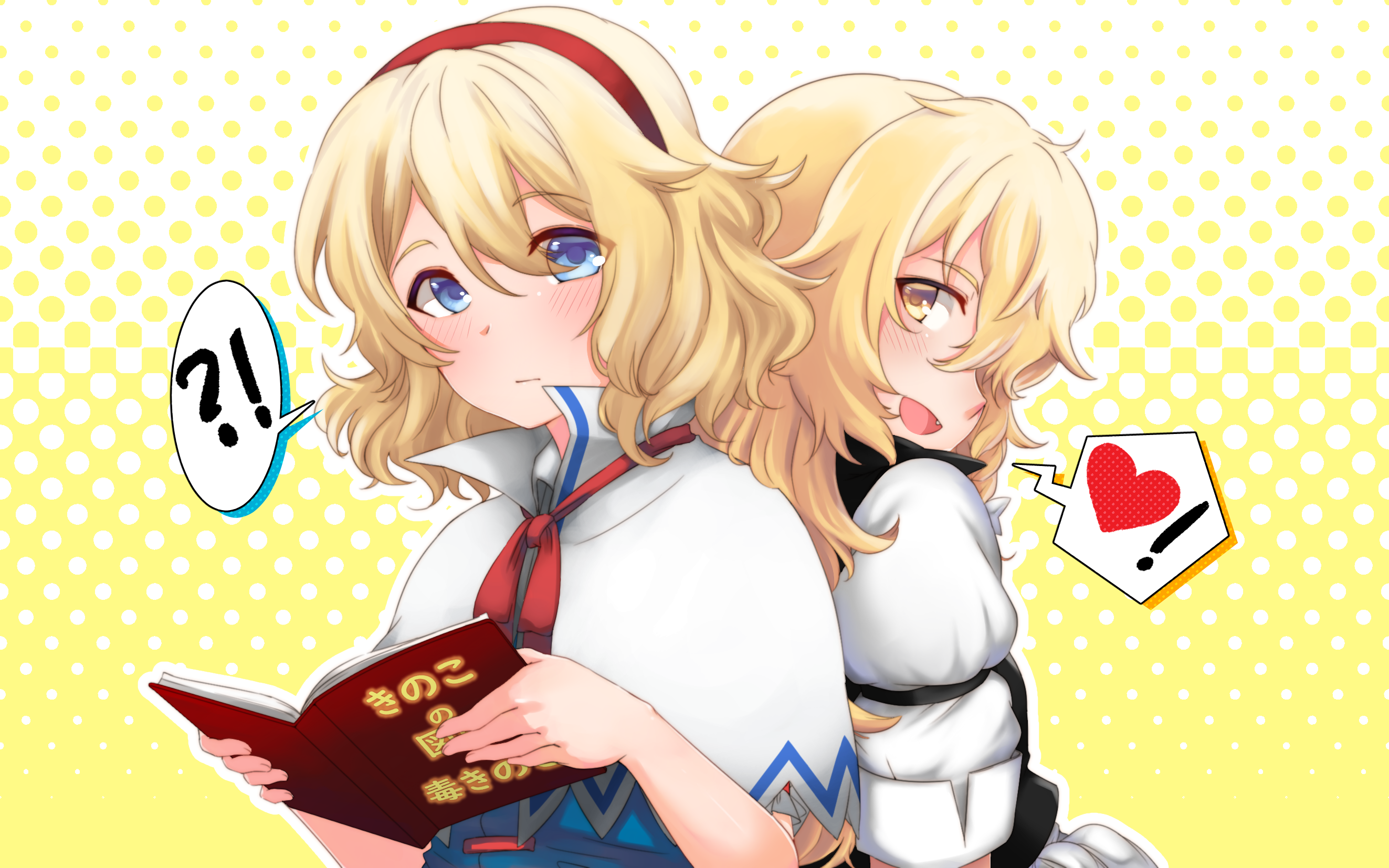 ! !? 2girls :d ? alice_margatroid back-to-back bakaryuu black_vest blonde_hair blue_dress blue_eyes blush capelet curly_hair dress expressionless fang hair_between_eyes hairband heart highres kirisame_marisa long_hair looking_at_another looking_back medium_hair multiple_girls missing_headwear open_mouth polka_dot polka_dot_background red_hairband shirt smile spoken_exclamation_mark spoken_heart spoken_interrobang spoken_question_mark touhou upper_body very_long_hair vest white_shirt yellow_eyes