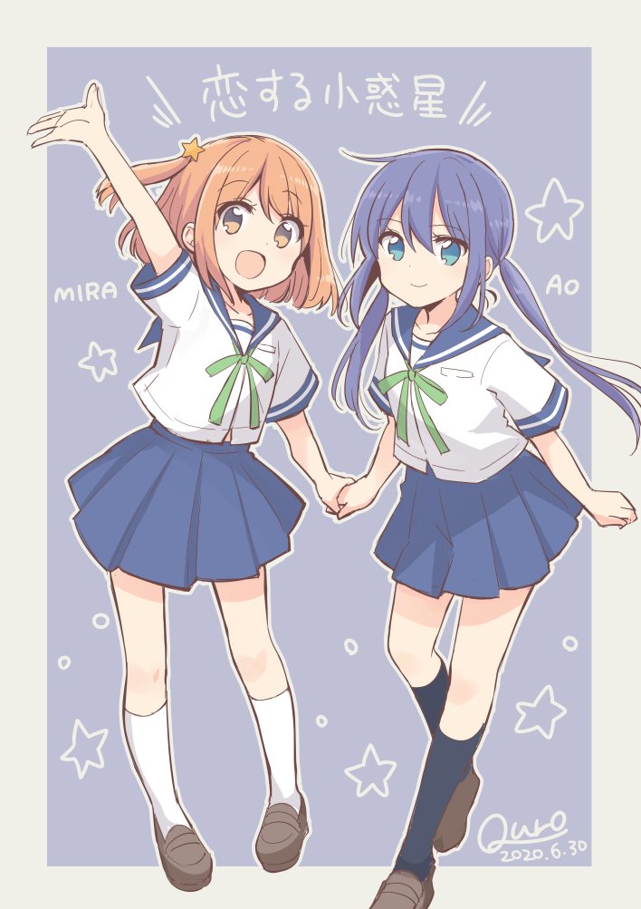 2020 2girls blue_eyes blue_sailor_collar bow dated green_bow green_neckwear green_ribbon hair_ornament holding_hands koisuru_asteroid konohata_mira long_hair manaka_ao multiple_girls quro_(black_river) ribbon sailor_collar school_uniform smile star_(symbol) star_hair_ornament twintails