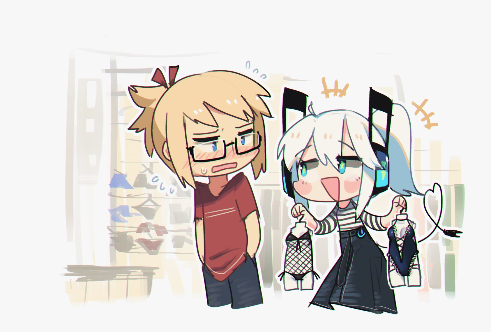 +++ 1boy 1girl :d aqua_eyes black-framed_eyewear blue_eyes blush borrowed_character cable chibi commentary digitan_(porforever) electric_plug electric_plug_tail english_commentary fishnet_swimsuit flying_sweatdrops glasses hair_between_eyes hand_in_pocket headphones heart heart_tail high-waist_skirt highres looking_at_another one-piece_swimsuit open_mouth original ponytail porforever rectangular_eyewear red_shirt richard_(gylmyr) semi-rimless_eyewear shirt short_ponytail sketch skirt smile striped_clothes striped_shirt sweatdrop swimsuit tail triangle_mouth under-rim_eyewear