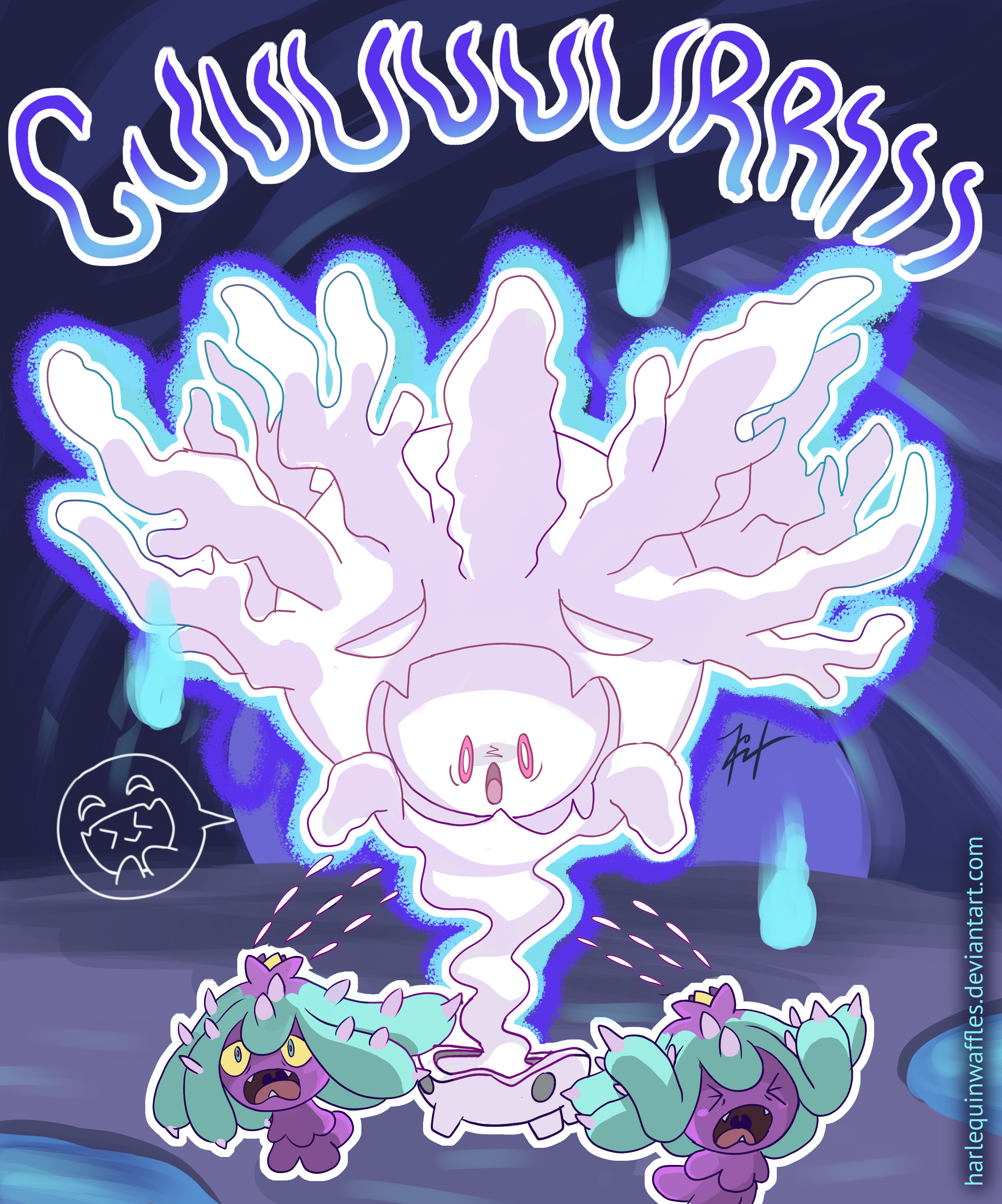 >_< absurdres aura cave closed_eyes commentary commentary_typo cursola dark_aura deviantart_username english_commentary fangs fleeing gameplay_mechanics gen_7_pokemon gen_8_pokemon harlequinwaffles highres mareanie nintendo no_humans open_mouth outline pokemon pokemon_(creature) pokemon_focus running signature tongue water watermark web_address white_outline