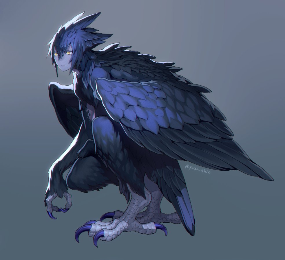 1boy blue_feathers claws feather_hair feathered_wings feathers gradient_background grey_background hair_between_eyes harpy_boy head_wings male_focus monster_boy original solo squatting twitter_username wings yellow_eyes yuzu_shio