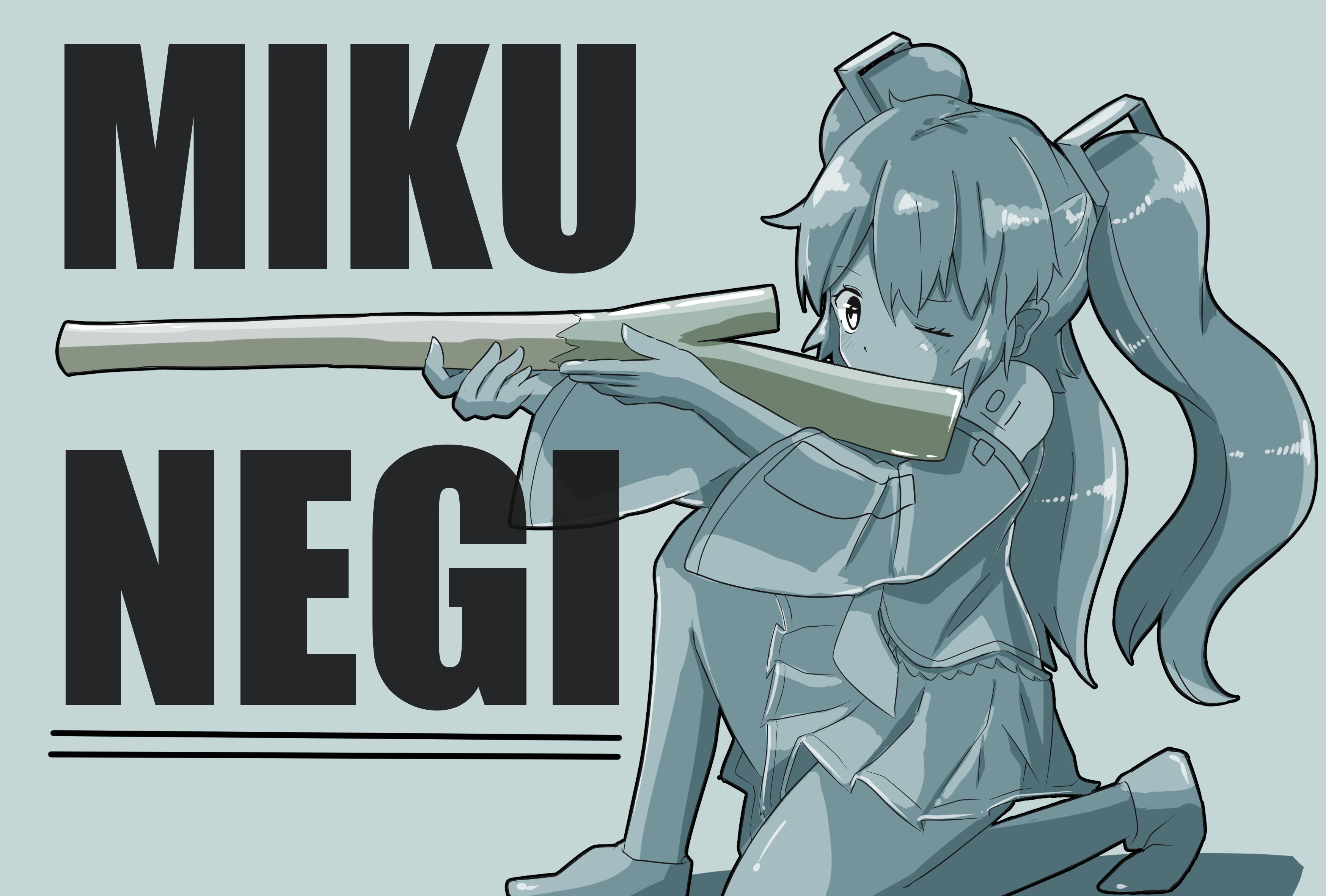 1girl absurdres aiming bare_shoulders black_skirt character_name commentary detached_sleeves english_text female_focus food hair_ornament hatsune_miku highres holding holding_food holding_spring_onion holding_vegetable kneeling kotatsune long_hair monochrome one_eye_closed pleated_skirt shirt shoulder_tattoo skirt sleeveless sleeveless_shirt solo spot_color spring_onion tattoo twintails vegetable vocaloid