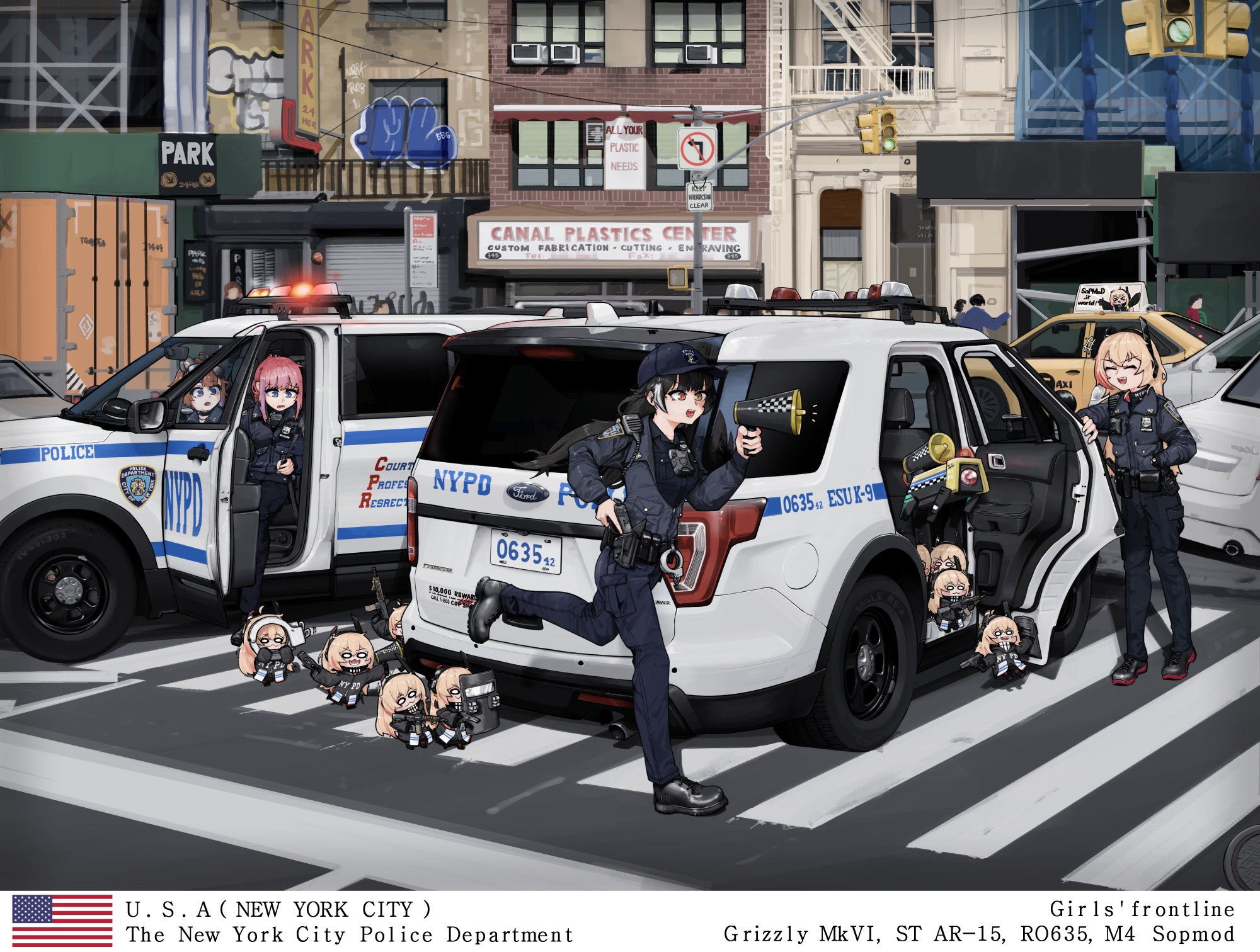 0_0 6+girls :3 alternate_costume assault_rifle ballistic_shield banana_(girls'_frontline) baseball_cap black_hair box_truck breast_pocket car carbine character_name commentary_request copyright_name crosswalk cuffs dinergate_(girls'_frontline) electroshock_weapon english_text ford_explorer girls'_frontline grizzly_mkv_(girls'_frontline) gun hairband hand_on_door handcuffs handgun hat heterochromia highres holding holding_handcuffs holstered jacket low_ponytail m4_carbine m4_sopmod_ii_(girls'_frontline) m4_sopmod_ii_jr megaphone motor_vehicle multiple_girls new_york_city new_york_city_police_department people pink_hair pistol pocket police police_car police_uniform ponytail real_world_location rifle riot_shield ro635_(girls'_frontline) road_sign shield sign sports_utility_vehicle st_ar-15_(girls'_frontline) taxi traffic_light truck uingssi vehicle_focus weapon