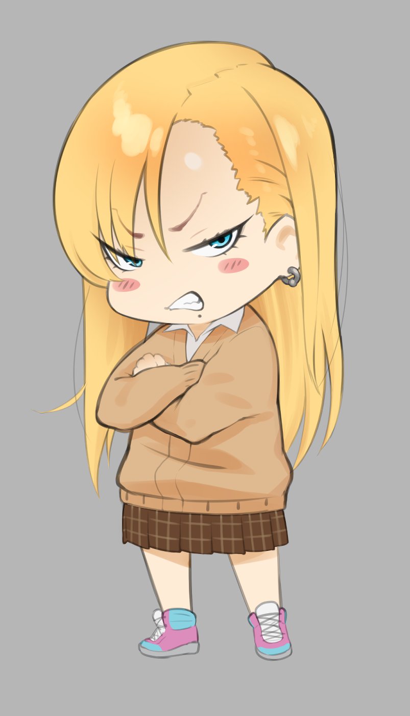 1girl angry blonde_hair blue_eyes blush blush_stickers cardigan chibi collared_shirt crossed_arms delinquent earrings grey_background grimace hair_between_eyes highres jewelry looking_at_viewer original plaid_clothes plaid_skirt pleated_skirt shirt shoes skirt sneakers solo suruga_kreuz white_shirt