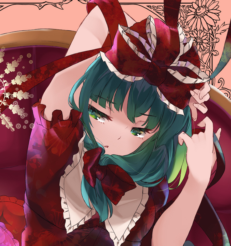 1girl arm_up blush bow dress frills front_ponytail green_eyes green_hair hair_bow hair_ribbon haya_taro_pochi kagiyama_hina long_hair looking_at_viewer parted_lips red_dress red_ribbon ribbon short_sleeves solo touhou upper_body