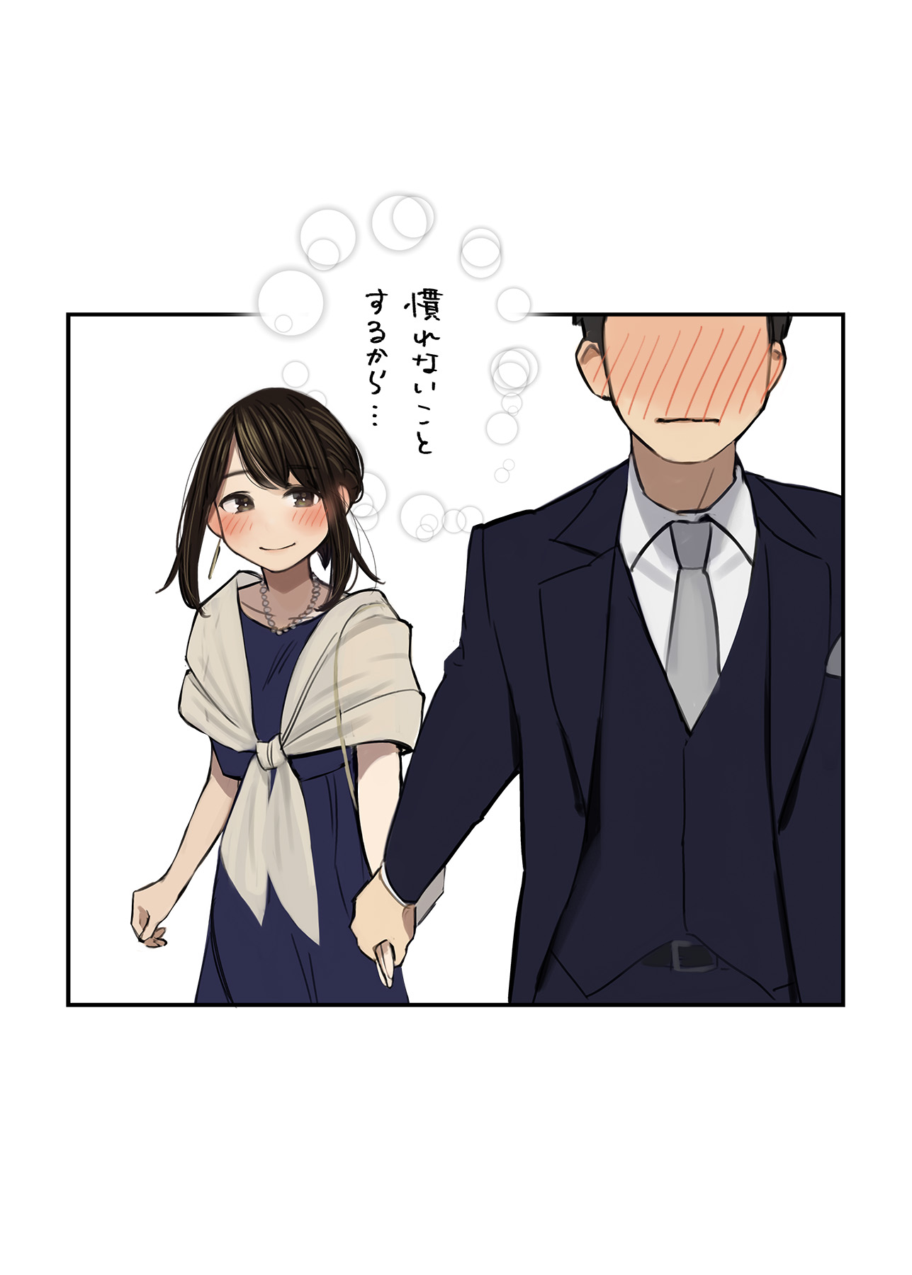 1boy 1girl bag belt black_belt black_suit blue_dress blush brown_eyes brown_hair closed_mouth douki-chan_(douki-chan) douki-kun_(douki-chan) dress earrings formal_clothes ganbare_douki-chan grey_neckwear handbag head_out_of_frame highres holding_hands jewelry looking_at_another necklace pearl_necklace sidelocks smile suit translation_request vest yomu_(sgt_epper)