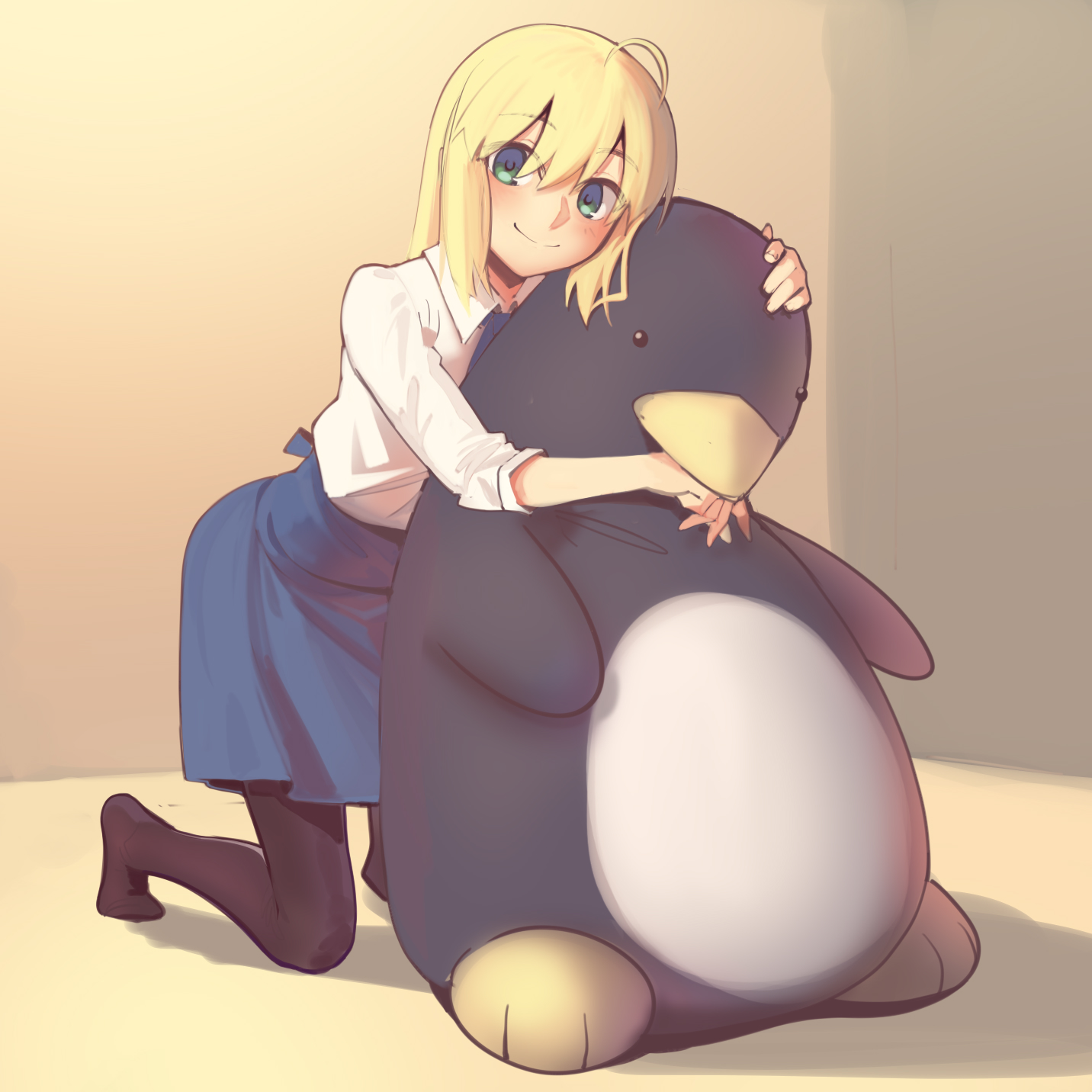 1girl ahoge artoria_pendragon_(fate) black_pantyhose blonde_hair blue_ribbon blue_skirt blush boa_(brianoa) closed_mouth collared_shirt fate/stay_night fate_(series) hair_down head_tilt high-waist_skirt highres kneeling long_hair long_sleeves looking_at_viewer neck_ribbon no_shoes pantyhose ribbon saber_(fate) shirt skirt smile solo stuffed_animal stuffed_penguin stuffed_toy white_shirt wing_collar yellow_background