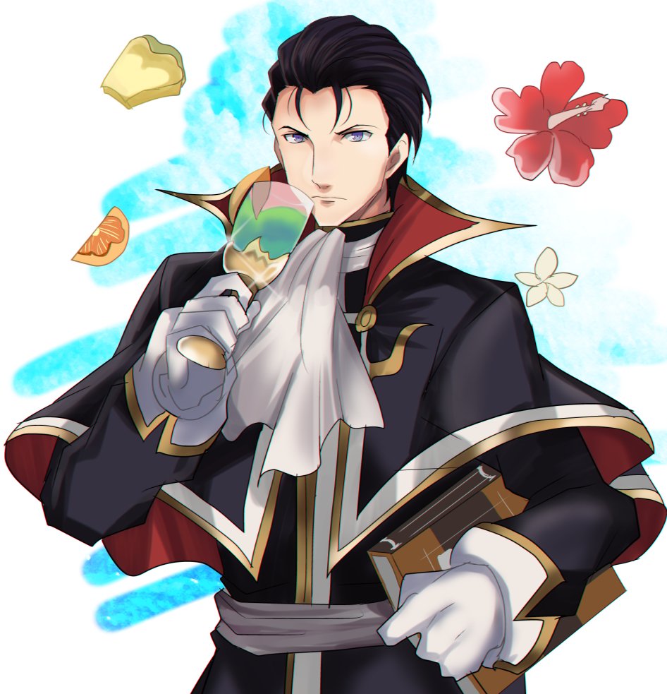 1boy 1girl ascot belt black_hair book chalice collar cup drink fire_emblem fire_emblem:_thracia_776 fire_emblem_heroes gloves nintendo reinhardt_(fire_emblem) rem_(eyes_410) sleeve_cuffs
