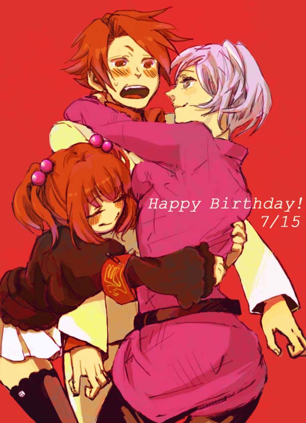 00s 1boy 2girls armband ayane_(altonoki) ayane_sora blue_eyes blush bow brother_and_sister brown_eyes closed_eyes frills hair_bobbles hair_bow hair_ornament hug jacket multiple_girls necktie red_hair ribbon short_hair siblings smile thighhighs twintails umineko_no_naku_koro_ni ushiromiya_ange ushiromiya_battler ushiromiya_kyrie white_hair zettai_ryouiki