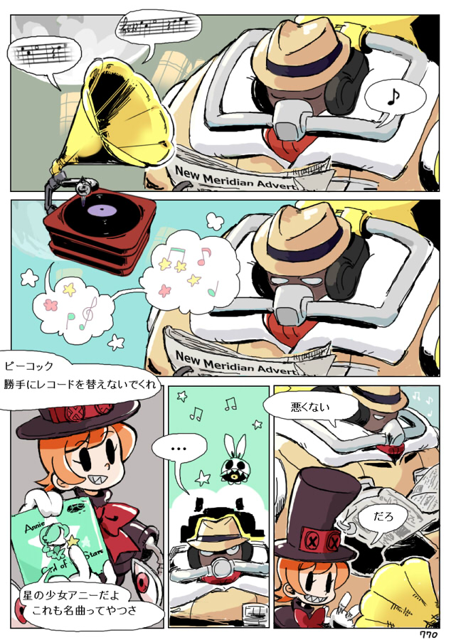 1boy 1girl 2018 770mk album_(object) annie_(skullgirls) big_band coat comic dark-skinned_male dark_skin fedora grey_eyes hat headphones holding mask musical_note orange_hair peacock_(skullgirls) phonograph red_eyes sagan_(skullgirls) sharp_teeth short_hair skullgirls smile speech_bubble teeth top_hat translation_request trench_coat