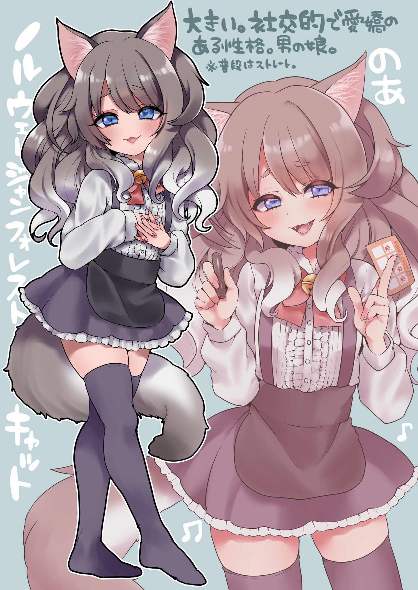 1boy :3 animal_ears bell black_legwear blue_eyes blush cat_boy cat_ears cat_tail crossdressing crossdressing_(mtf) fangs full_body grey_hair highres long_hair looking_at_viewer male_focus multiple_views original shirt skirt suspender_skirt suspenders tail thighhighs trap usagigenki white_hair white_shirt