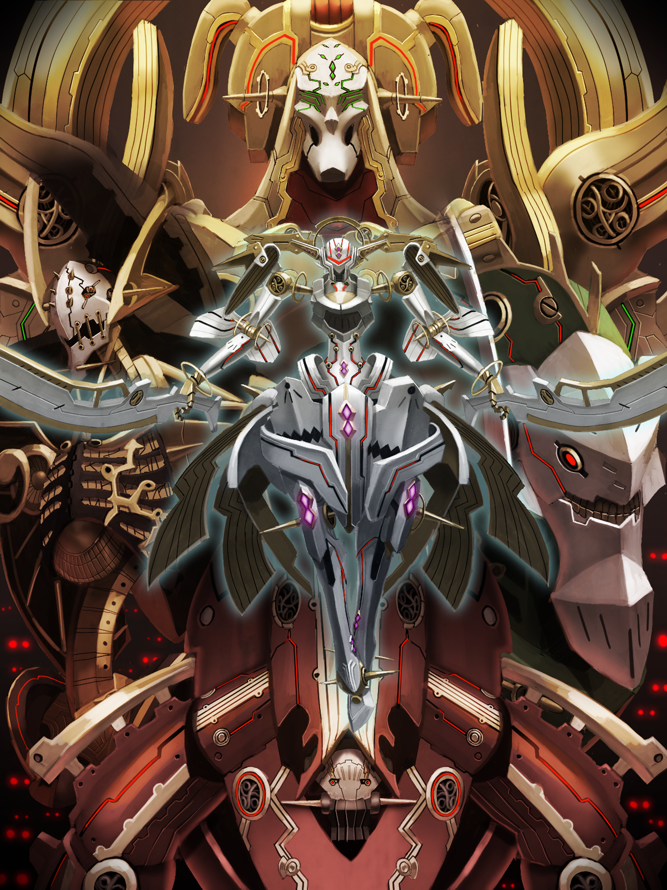 absurdres dual_wielding face_nemesis glowing glowing_eyes halo highres holding jade_face mecha mechanical_halo metal_face_(xenoblade) moyashi_(karamisouma) nintendo no_humans robot sword teeth weapon xenoblade_chronicles_(series) xenoblade_chronicles_1 xord_(xenoblade) yaldabaoth_(xenoblade)
