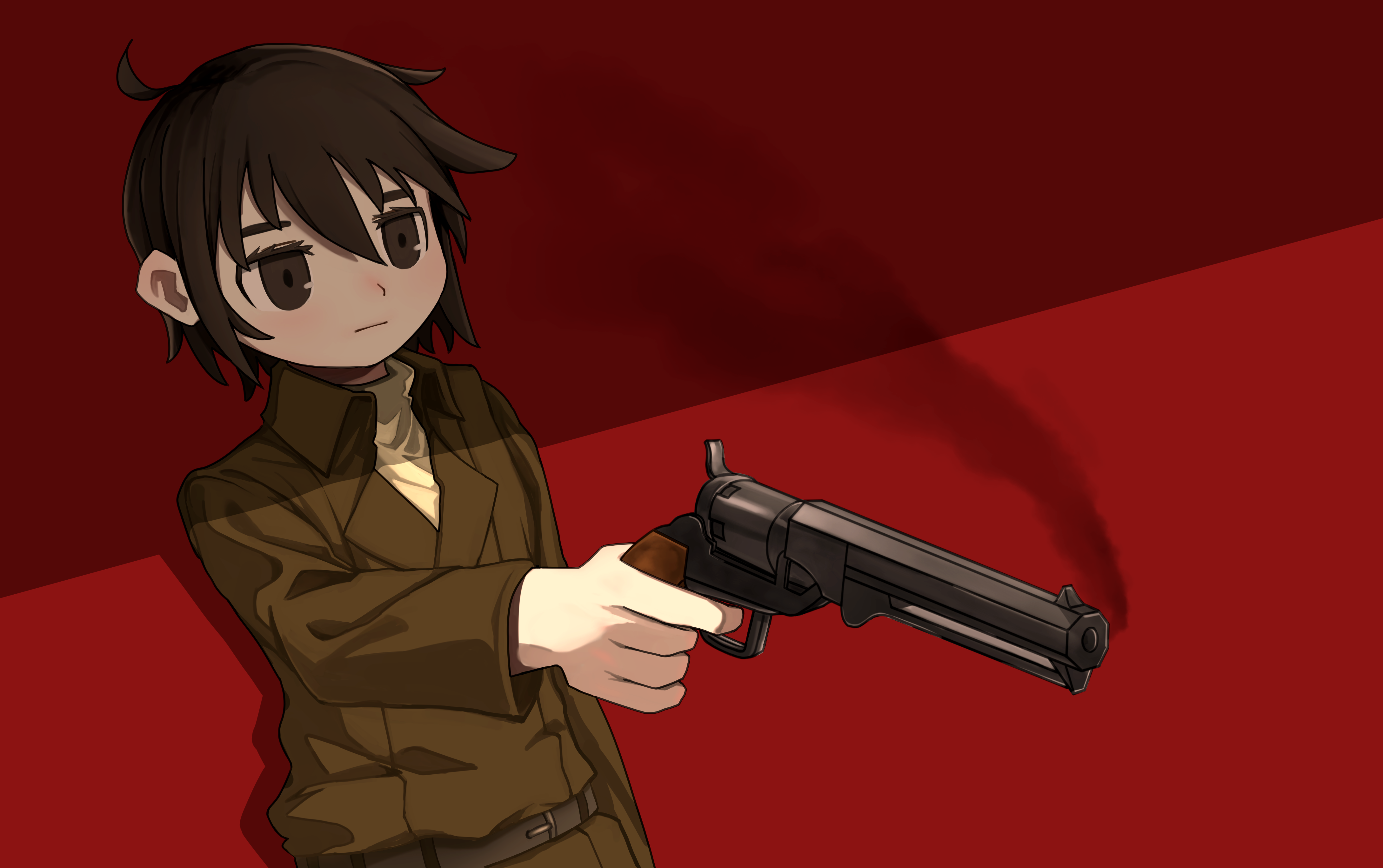 absurdres androgynous belt black_eyes black_hair brown_coat coat drawfag gender_request gun handgun highres holding holding_gun holding_weapon kino_(kino_no_tabi) kino_no_tabi red_background short_hair smoke standing upper_body weapon