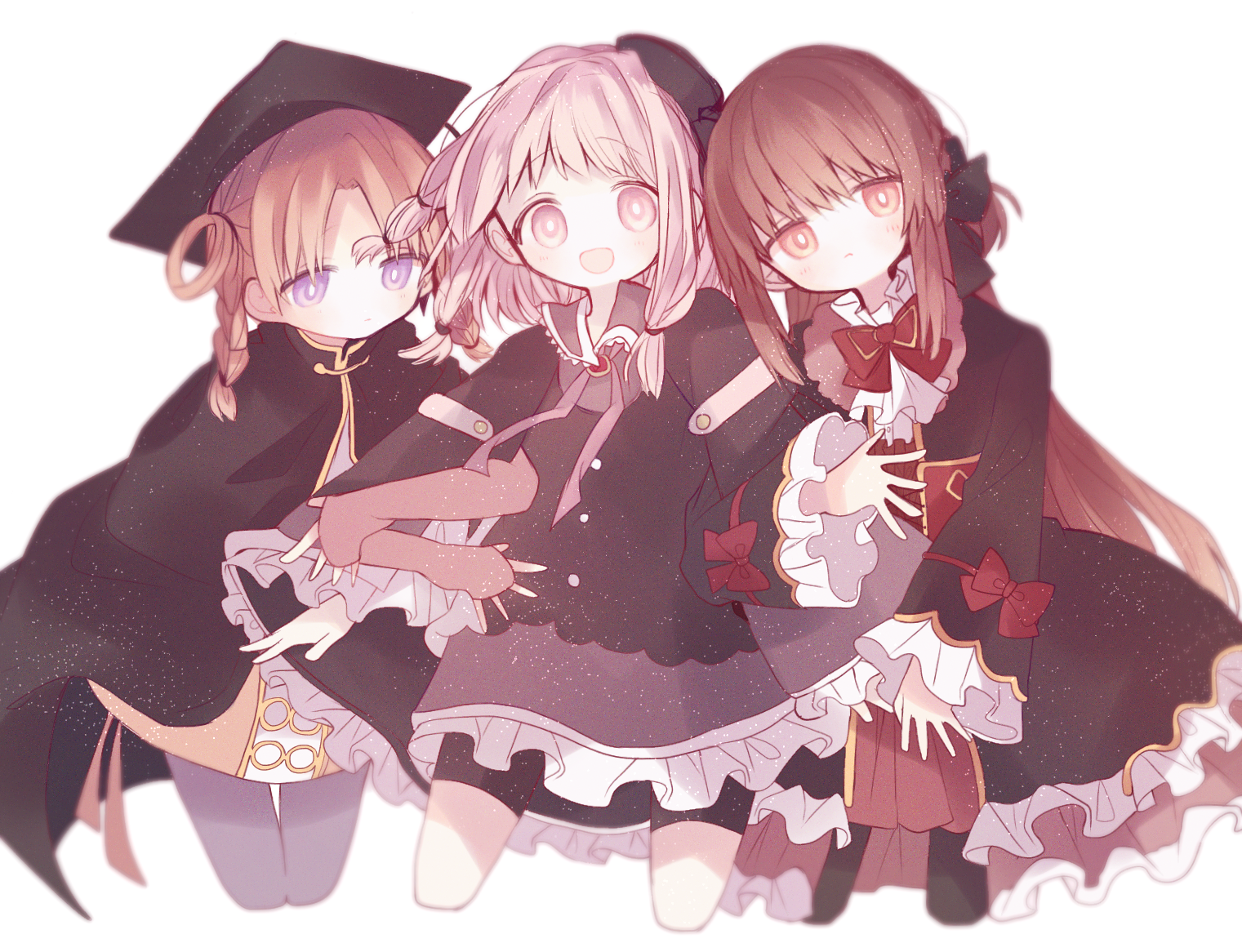 3girls :d annoyed arms_at_sides bare_legs beret bike_shorts black_cape black_dress black_headwear black_legwear black_ribbon blunt_bangs blurry blush braid brown_hair cape capelet child closed_mouth collared_capelet commentary_request cropped_legs depth_of_field double_bun dress expressionless frilled_capelet frilled_dress frilled_sleeves frills frown furrowed_brow girl_sandwich hair_bun hair_ribbon happy hat hiiragi_nemu legs_apart light_brown_hair light_particles lineup locked_arms long_hair long_sleeves looking_at_viewer looking_down magia_record:_mahou_shoujo_madoka_magica_gaiden mahou_shoujo_madoka_magica medium_hair mortarboard multiple_braids multiple_girls neck_ribbon no_nose open_mouth outstretched_arms pantyhose pink_hair pout purple_eyes purple_legwear red_ribbon ribbon sandwiched satomi_touka shaded_face sidelocks simple_background sleeves_past_wrists smile suisei_(su_rkgk) tamaki_ui tareme thigh_gap twin_braids white_background wide-eyed yellow_eyes