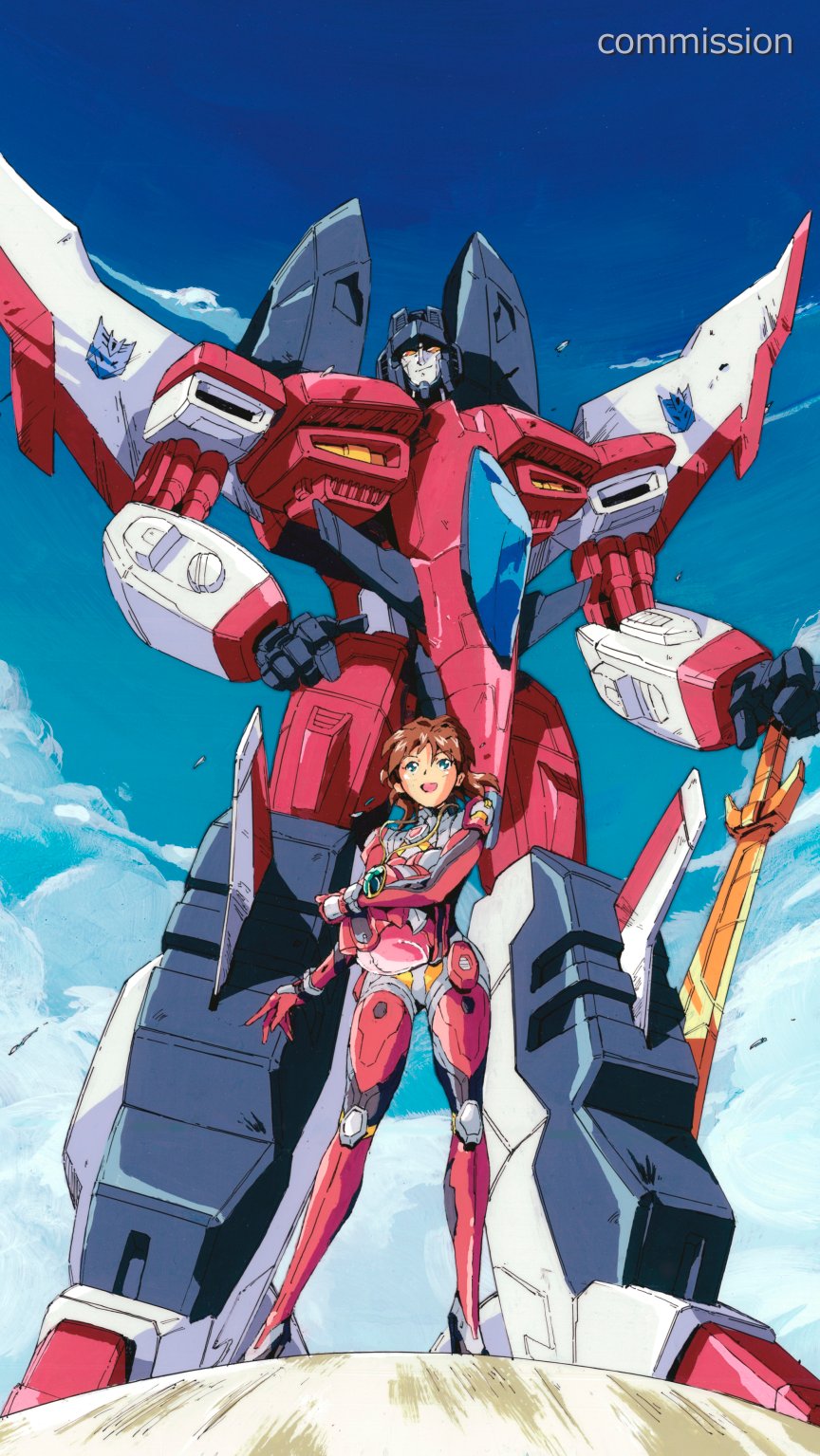 1boy 1girl alexis_(transformers) artist_request blue_eyes brown_hair commission decepticon hand_on_own_hip helmet highres holding holding_sword holding_unworn_helmet holding_weapon looking_up marble-v mecha mechanical_wings open_mouth pilot_suit robot starscream sword transformers transformers:_armada transformers_unicron_trilogy unworn_helmet weapon wings
