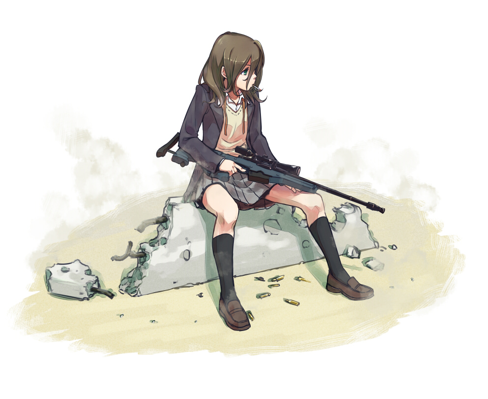 1girl ai_arctic_warfare black_socks bolt_action brown_hair brown_shoes cigarette concrete denchuubou full_body green_eyes grey_jacket grey_skirt gun jacket kneehighs long_hair original pleated_skirt rebar rifle school_uniform shoes sitting skirt sniper_rifle socks solo weapon white_background
